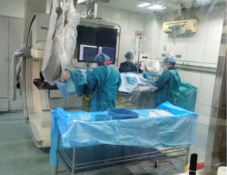 期间,心内科CCU陆远主任团队(术者:张敏、段洋、李志、刘东辰)进行了两场高危急性心肌梗死的手术直播,争分夺秒开通罪犯血管,并在保证患者生命体征、血流动力学稳定的前提下,进行了冠脉血管内超声(IVUS)精准评估,实现冠心病介入的精准化治疗,受到国内同行专家的高度赞誉。其中一台急诊手术为五年前支架内闭塞,在IVUS评估后确定为慢性纤维化斑块增生基础上的急性闭塞,原支架贴壁不良,在腔内影像学的指导下对病变部位进行切割后高压扩张原支架整形,药物球囊扩张避免了再次支架植入。