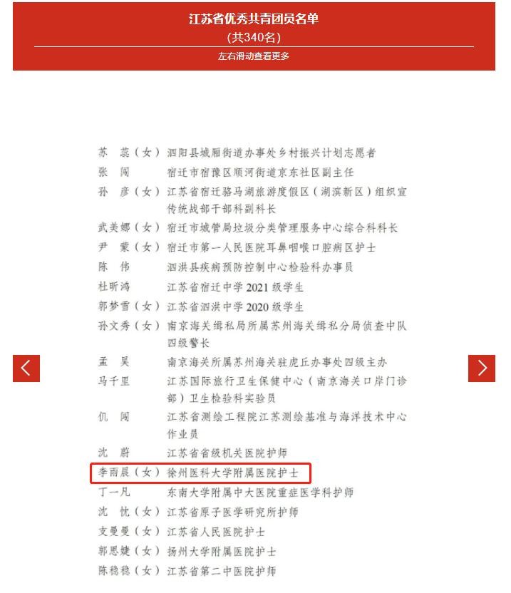 自工作以来,李雨晨坚持以病人为中心,踏实工作,积极进取,曾被评为“徐州医科大学优秀共青团员”。疫情期间,她多次参与徐州市核酸检测,并参与支援苏州和西藏,表现突出,被评为“拉萨市抗击新冠肺炎疫情优秀援助医疗队员”。此次荣获“江苏省优秀共青团员”称号,彰显了当代徐医附院青年人的风采,进一步激励和鼓舞了我院青年坚定理想信念、积极投身医院高质量发展实践的热情,以实际行动为医疗卫生事业的蓬勃发展贡献青春力量!