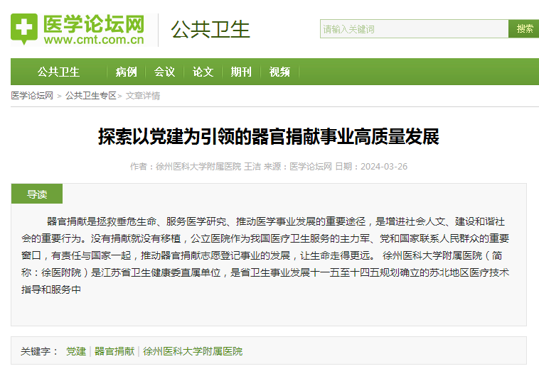 2024年3月,中国卫生健康思想政治工作促进会(简称“政促会”)公立医院分会公布了2023年度党建业务深度融合案例征集与评选结果,我院党委第六党总支报送的《探索以党建为引领的器官捐献事业高质量发展》案例荣获优秀案例。