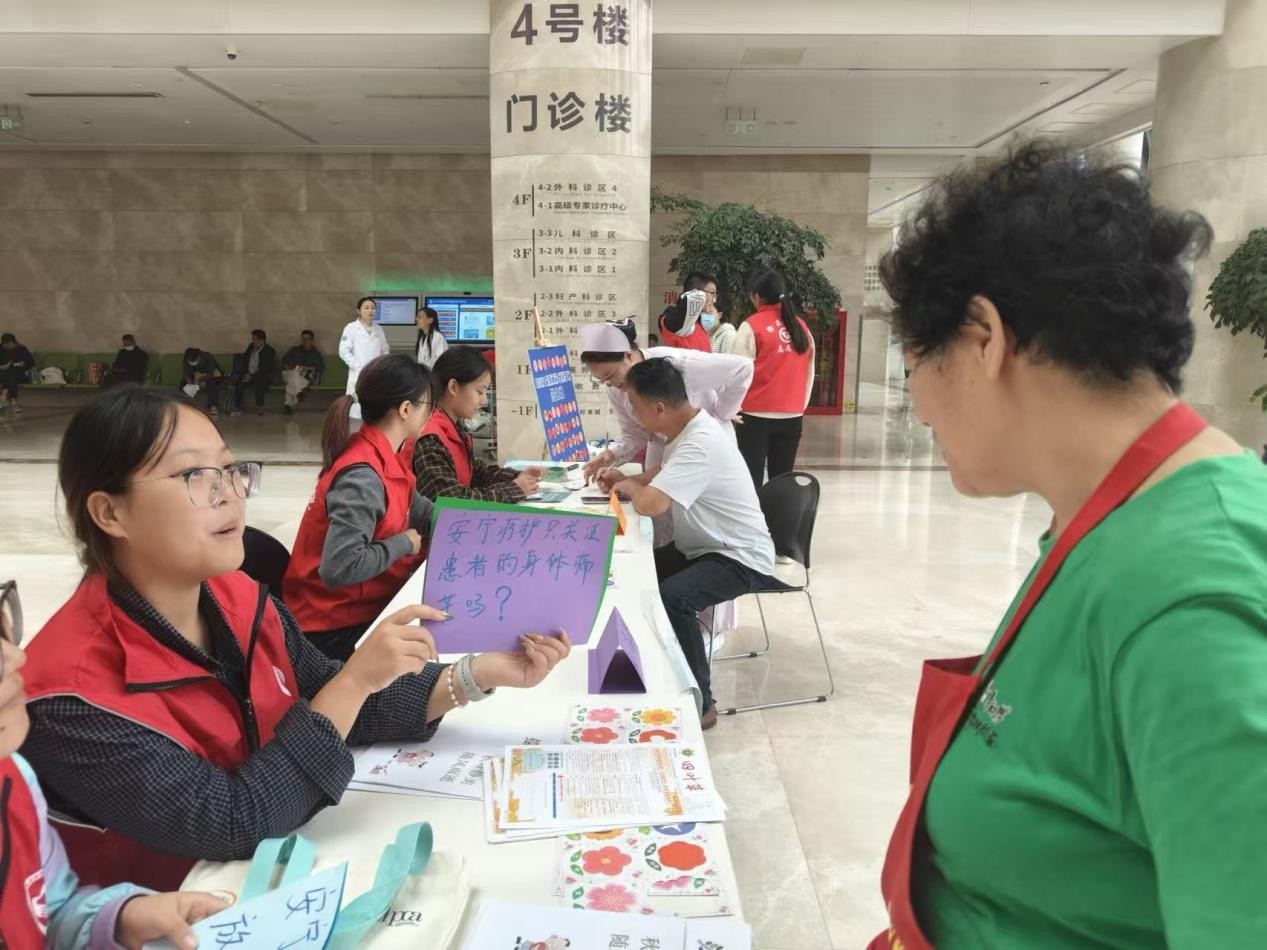 在第21 个 “世界安宁缓和医疗日” 来临之际,为促进安宁缓和医疗理念深入公众视野,10 月 10 日上午,徐医附院肿瘤内科携手团委、医务社工部,在鲲鹏路院区门诊大厅联合开展 “实现承诺,全民享有” 主题快闪活动,以轻松互动的创新形式,为现场公众带来一场兼具知识与温度的医疗科普体验。