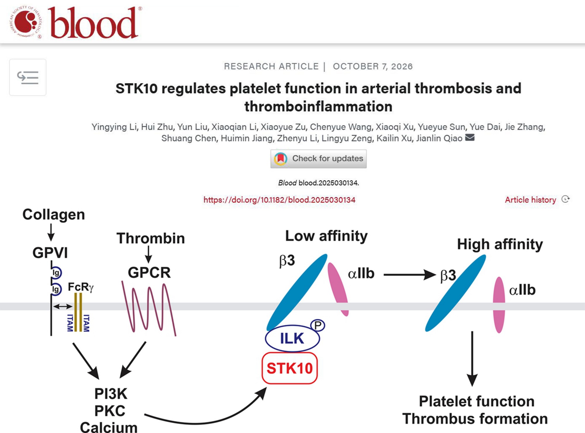 近日,我院血液科乔建林教授团队在血小板和血栓领域取得重要进展。相关研究成果以“STK10 regulates platelet function in arterial thrombosis and thromboinflammation ”为题,发表在血液学领域顶级期刊Blood(IF=23.1,中科院1区Top期刊)。